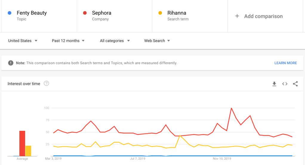 When looking at the Google Trends data analysis, before the holiday season, the terms “Rihanna” (yellow) and “Sephora” (red) are showing similar search data. This is typically when Rihanna drops new products that this correlation occurs. This is interesting data being that the term “Fenty Beauty” (blue) does not get searched as much.