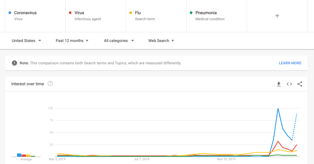 Looking at the Google Trends data analysis above, the term “Virus” (red) seems to not be as strong of a search but following the same patterns as “Cornovirus” (blue). These search terms had reached the same peak on the same days at points corresponding to the news articles that have been released.